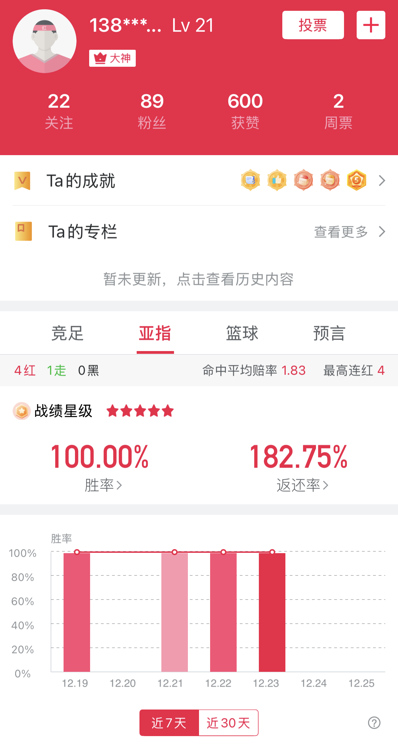 用户138****2323 再次红单,目前已经4连红,亚指近11中10,今日他免费公推了一场沙特联赛,费哈对阵哈森姆的比赛,感兴趣的小伙伴可以点击用户头像查看最新发帖即可。