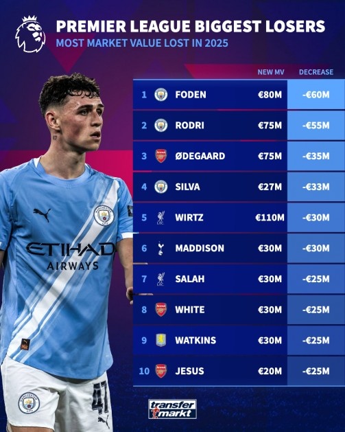 北京时间12月26日,德国转换市场列出了2025年英超联赛球员身价下跌排名,其中曼城球星福登身价下滑6000万欧最多,其次是罗德里下滑5500万欧元第二。