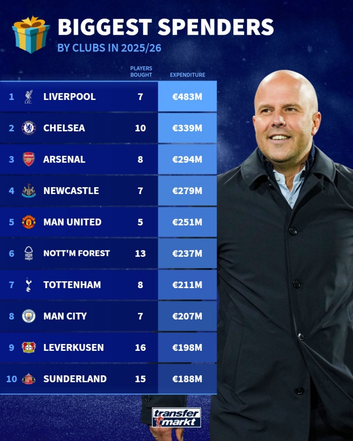 北京时间12月26日,德国转会市场统计出了在2025/26赛季引援花费最多的前十支球队,其中利物浦以4.83亿欧元排名第一,第二名是切尔西3.39亿欧元,第三名阿森纳2.94亿欧元,花费最多的前十排名中有9支来自英超联赛。