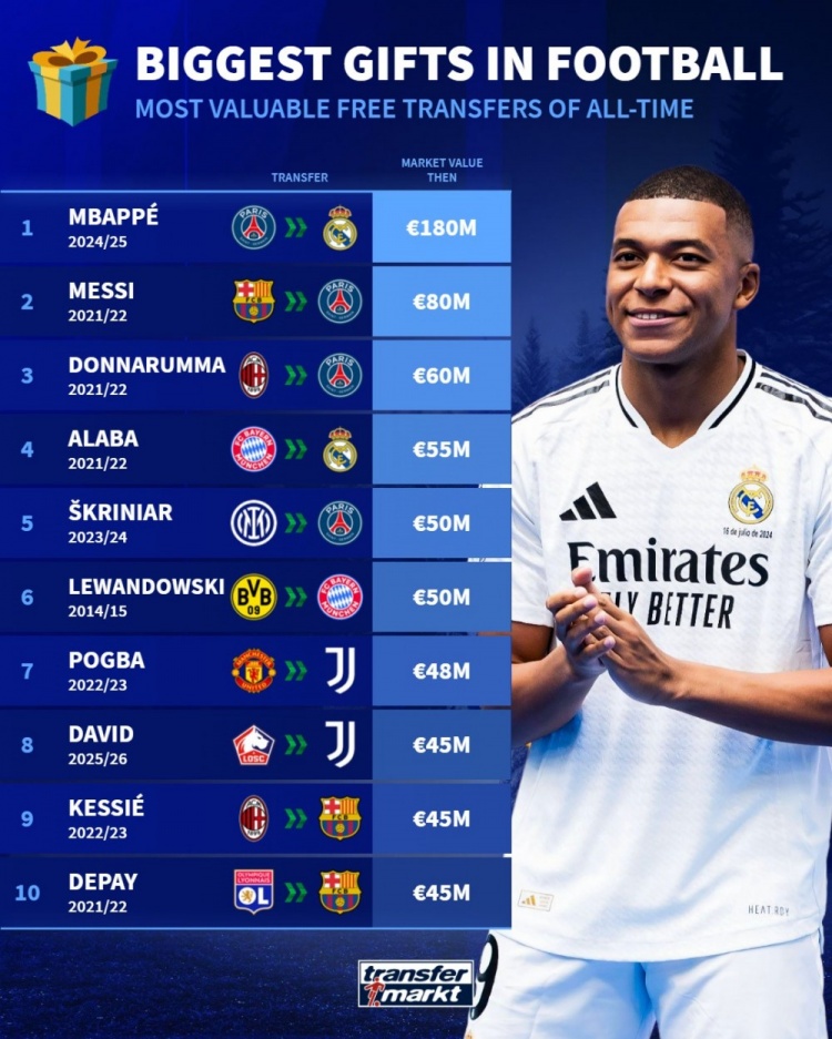 德转盘点足坛免签球员身价榜:姆巴佩1.8亿居首,梅西第2