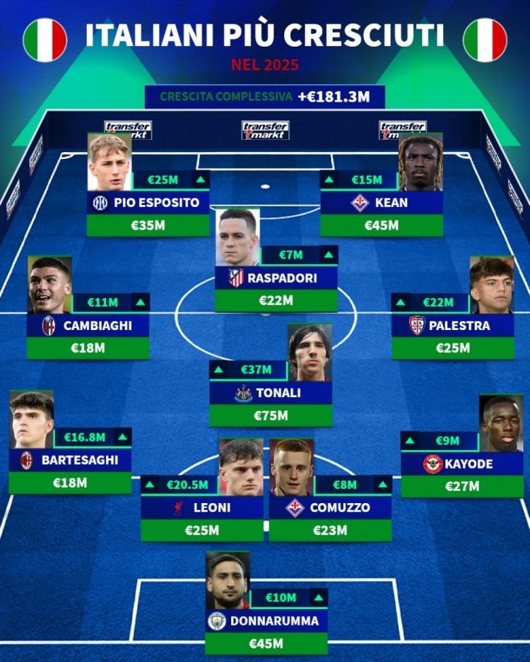 北京时间12月26日,德国转会市场列出了2025年意大利球员身价上涨幅度最大的11人阵容,其中托纳利上涨3700万欧、埃斯波西托上涨2500万欧。