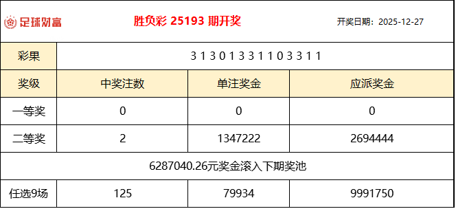 胜负彩25193期开奖:头奖空开滚存628万,二等奖134万