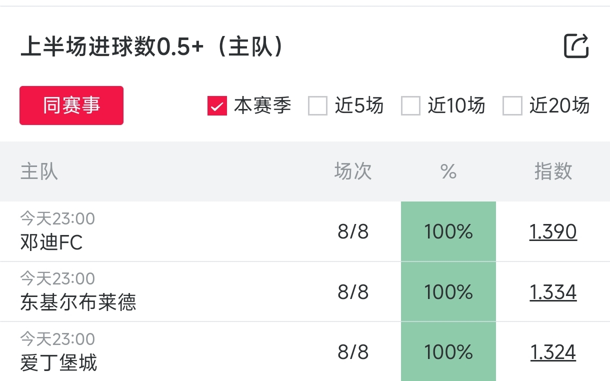 今晚三场比赛客队半场进球数0.5+为100%,平均指数1.34,点指数可设置提醒。