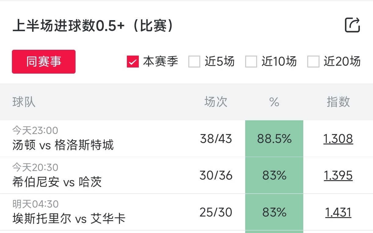 这是今晚三场比赛半场进球数0.5+,其中一场概率高达88.5%,另外两场是83%,平均指数1.37。