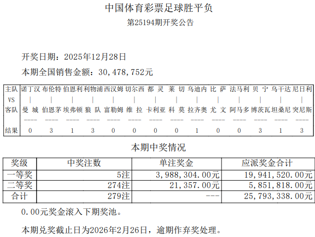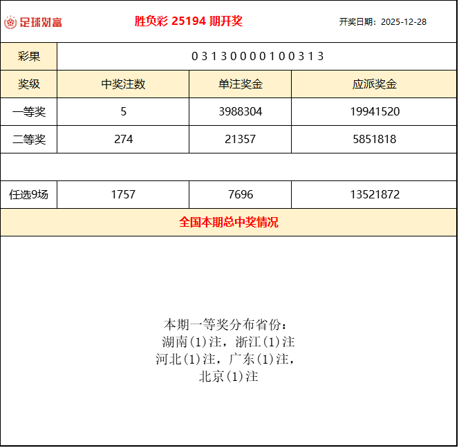 胜负彩25194期开奖:曼城客场险胜,一等奖5注398万
