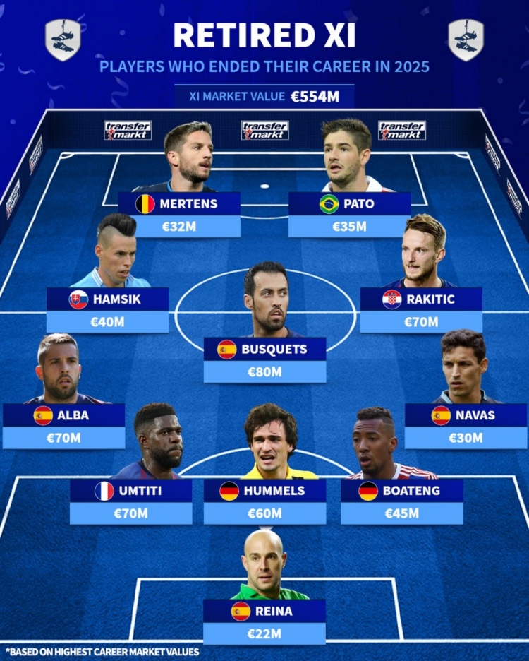 近日,德国转会市场盘点了2025年选择退役的最佳11人球员阵容,布斯克茨、拉基蒂奇、阿尔巴三位巴萨旧将领衔,帕托和梅尔滕斯组成双箭头,哈姆西克、胡梅尔斯等名将在列,并标注了他们的德转历史最高身价。