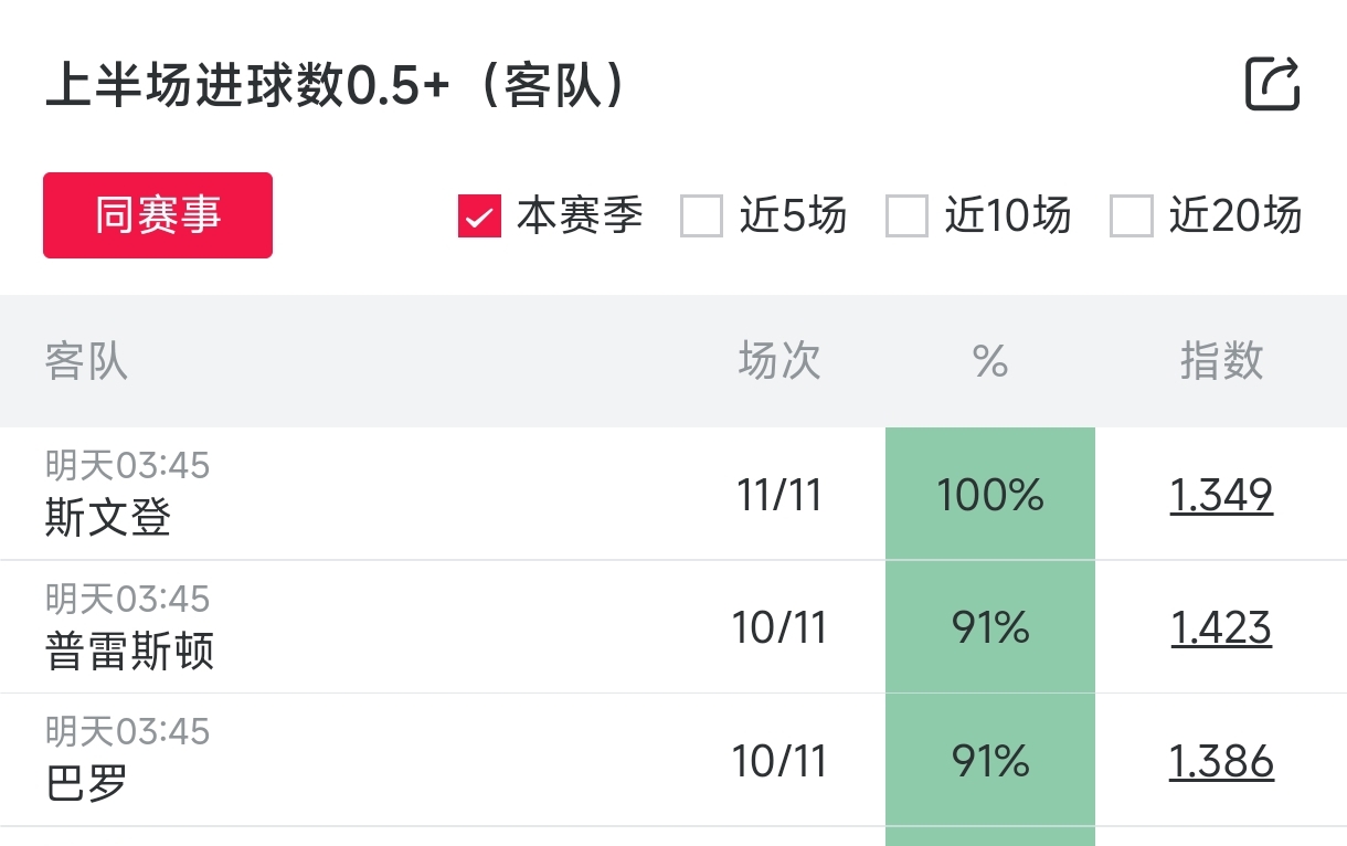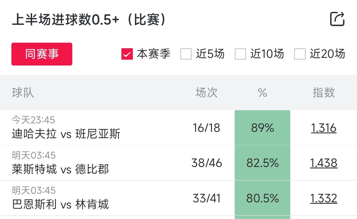 昨天给大家介绍了7场比赛上半场进球,7中5成绩还算可以,这两天16中14,已经非常好了,大家自己去看的时候还是多多关注球队其他数据,比如近期状态、进球能力和防守能力,我也只是给出一个大概,怎么选择还是需要去多看,数据库操作方法还是放在文章底部,其实很简单,大家可以多试试。