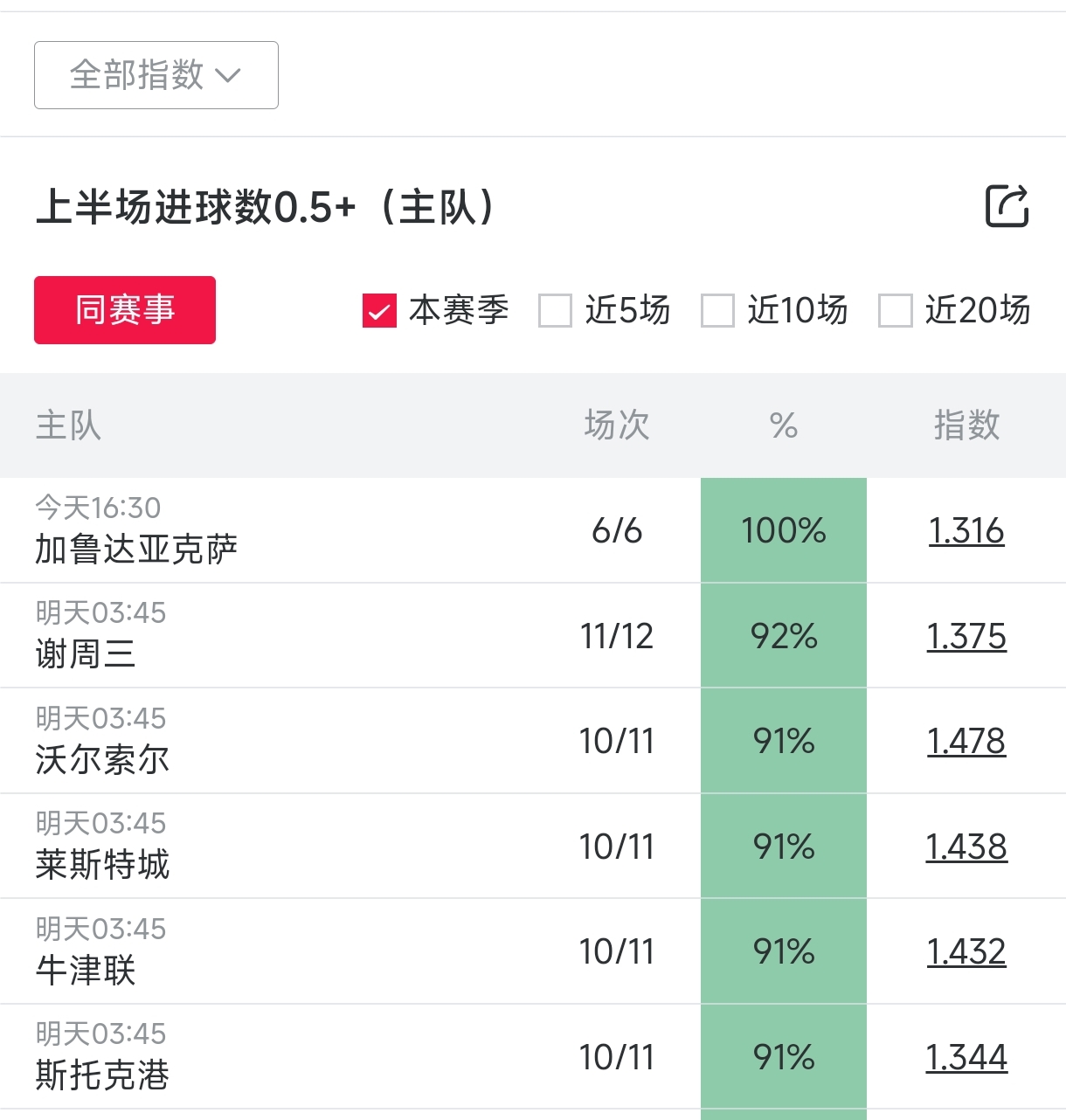 今天我给大家提醒11场比赛,其中有9场概率是90%以上,莱斯特城两次出现在表里,看上去进球概率确实很大,剩下的大家自己去看看吧,就不过多阐述了。