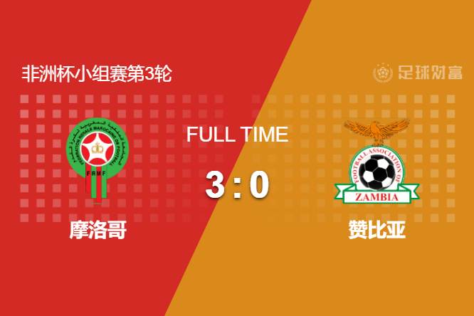 最终全场比赛结束,摩洛哥3-0大胜赞比亚,晋级非洲杯淘汰赛。