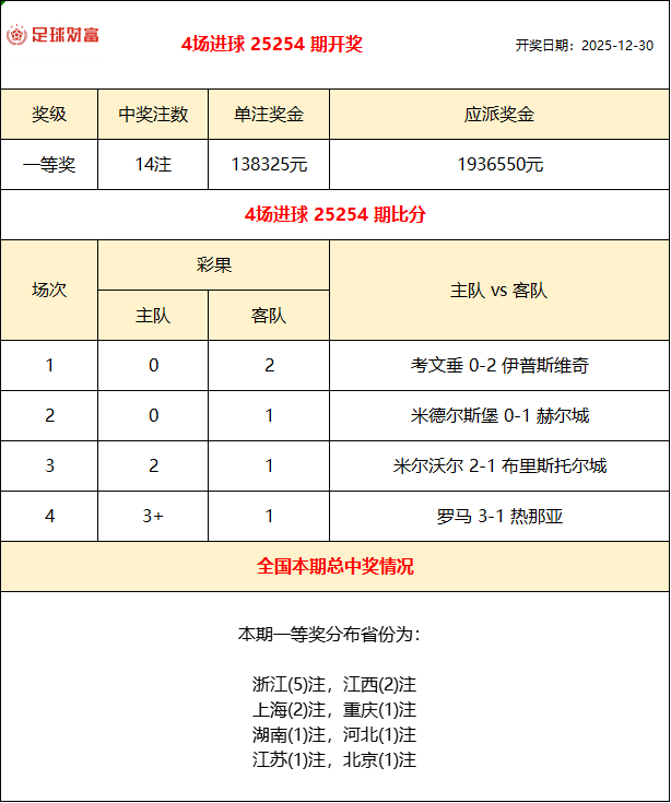 4场进球25254期开奖:罗马3-1热那亚!头奖14注13.8万