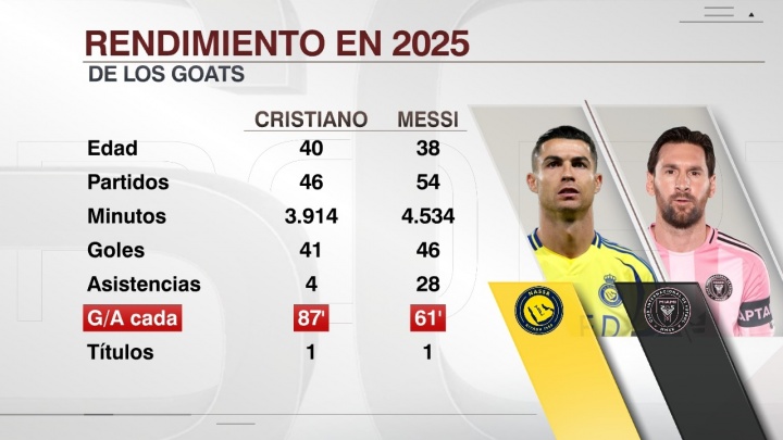 近日,ESPN统计出了梅西和C罗在2025年的数据对比,两人分别效力美职联迈阿密国际和沙特联利雅得胜利。