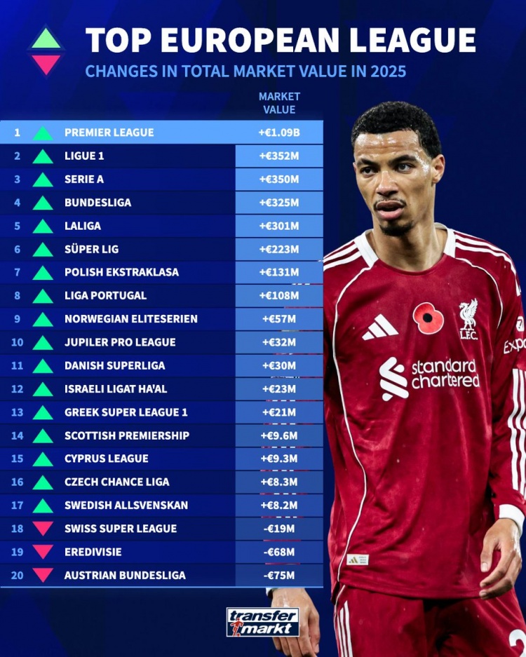 2025年即将过去,德国转会市场网站统计了欧洲各大联赛身价涨幅排名,其中今夏经过多笔引援的英超联赛涨幅9000万欧元排名第一,法甲涨幅了5200万欧元排名第二,意甲排名涨幅第三。