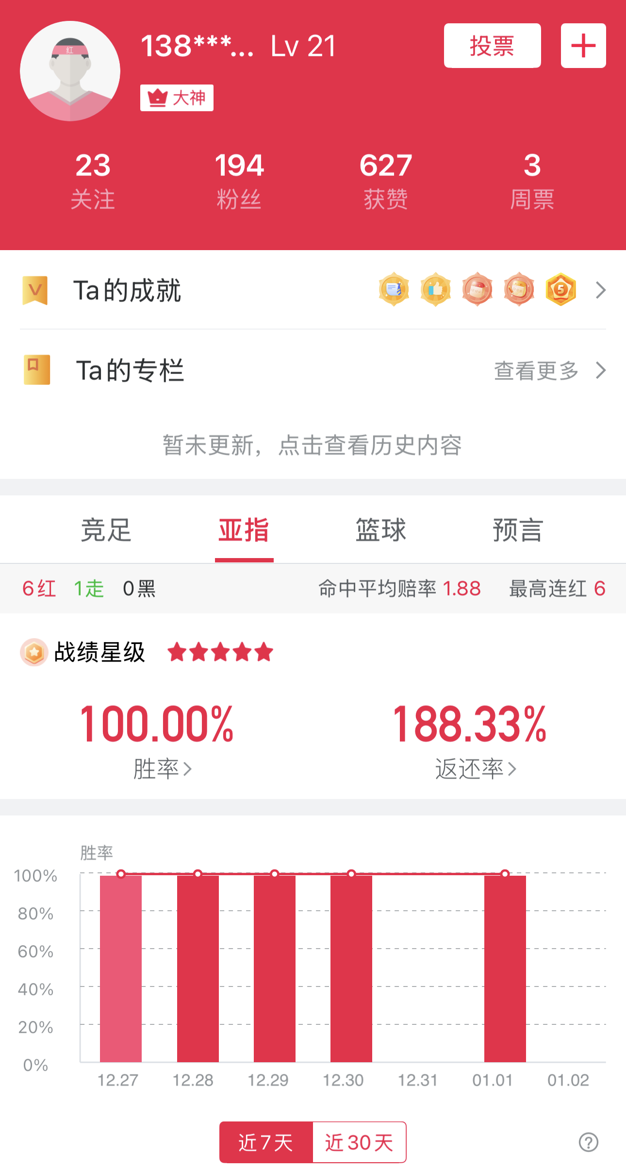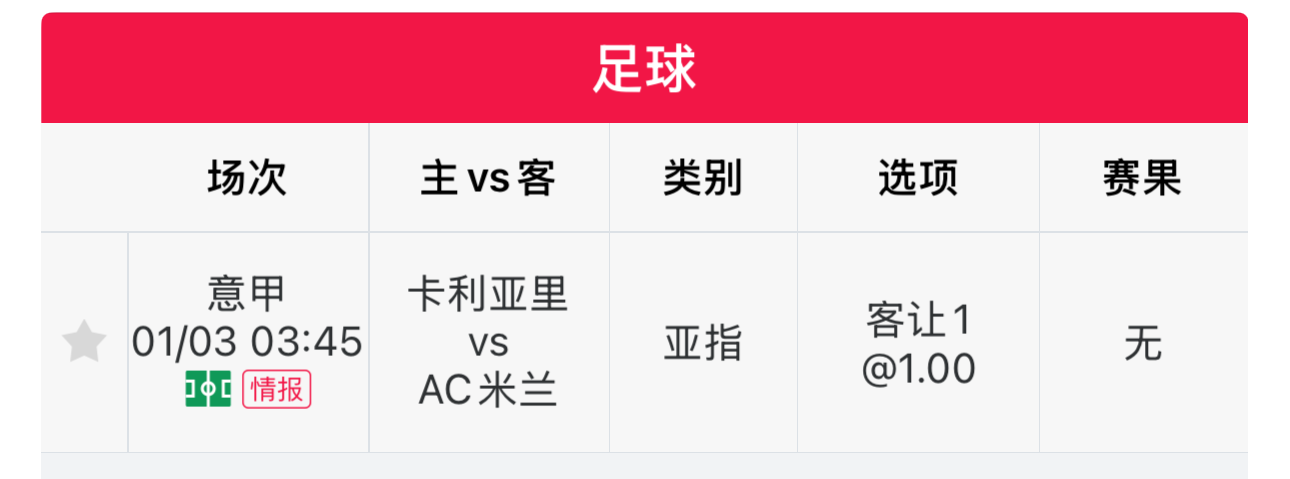用户138****2323 目前亚指已6连红,昨日他免费公推的英冠联赛再次命中,可谓状态正佳。今日他推荐了一场意甲联赛,感兴趣的朋友可以点击用户最新发帖查看。