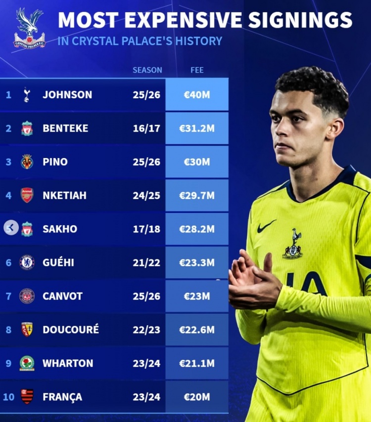 英超球队水晶宫官宣签下布伦南-约翰逊,4000万欧元的转会费创造了球队最新的转会纪录。德国转会市场网站盘点了水晶宫队史引援榜单,其中约翰逊排名第一,本特克16年从利物浦转会加盟排名第二。