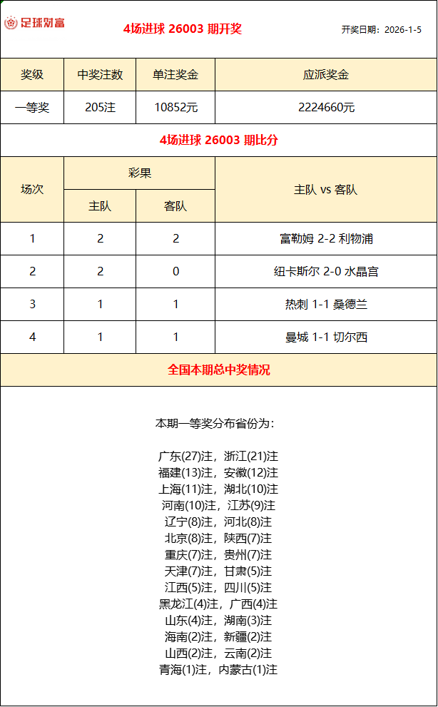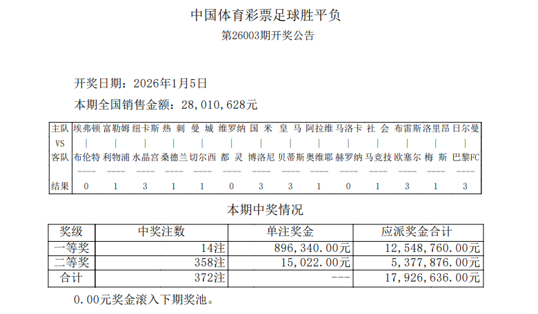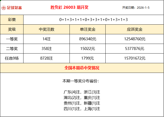 胜负彩26003期开奖:切尔西绝平曼城!头奖14注89万