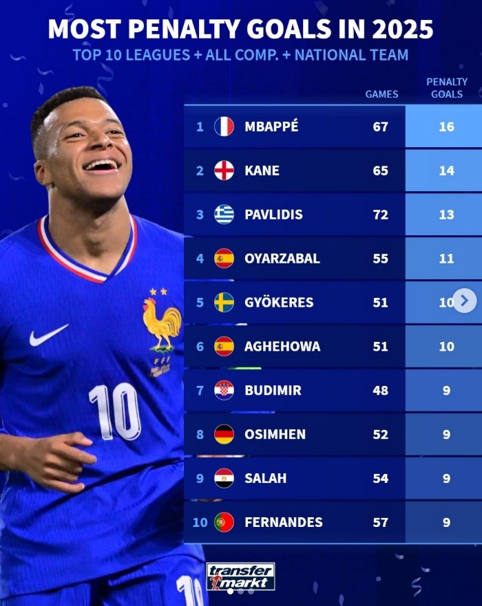 近日,德转盘点了2025年效力欧洲前十联赛的球员各项赛事点射进球榜,姆巴佩在全年67场比赛中打入16粒点球,高居榜首,凯恩以65场14粒点球位居次席。排名第三的是希腊前锋帕夫利迪斯,他在72场比赛中罚入了13个点球。