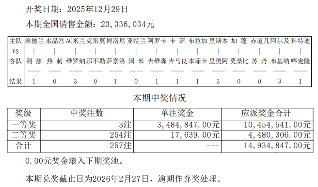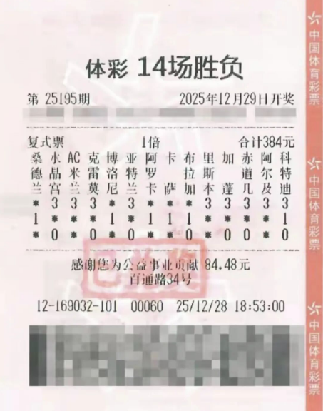 在2025年末,来自广西的彩民花费384元购买了传足14场胜负第25195期彩票,最终他拿下了1注一等奖3484847元,8注二等奖合计141112元,这张传足彩票最终奖金为3625959元,咱们看看他的购买方式。