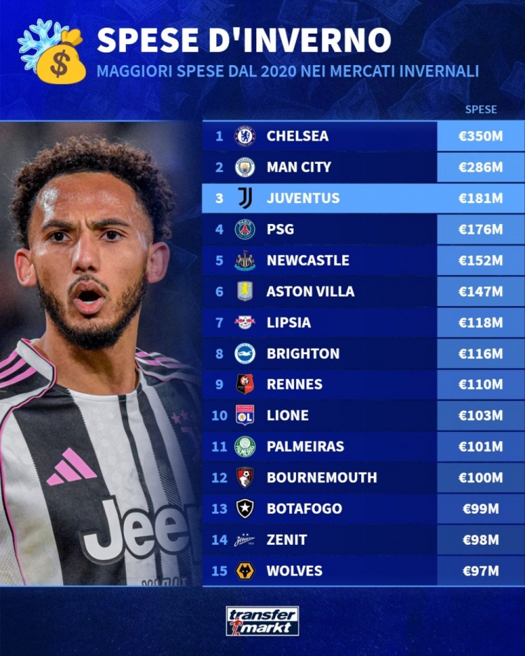 近日,德国转会市场列出了自2020年到2025年冬季转会窗口支出最高的俱乐部排名,其中切尔西以3.5亿欧元排名居首,曼城2.86亿欧第二,尤文1.81亿欧排名第三位,前十有5支是英超球队。