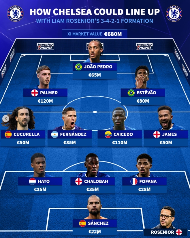 英超豪门切尔西已经官宣了新帅罗塞尼尔,德国转会市场网站曝出了罗塞尼尔执教后的潜在首发阵容,其中帕尔默与若昂·佩德罗、埃斯特旺组成锋线三叉戟,中场则有恩佐和凯赛多坐镇,两个边路将由库库雷利亚和詹姆斯出任。