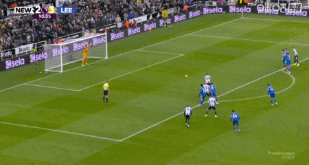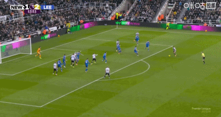 第54分钟,纽卡再次扳平!吉马良斯禁区前挑传,乔林顿头球蹭入左上角,2-2!!