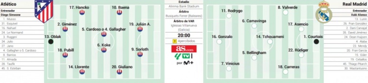 皇马首发:1-库尔图瓦;18-卡雷拉斯、22-吕迪格、17-阿森西奥、8-巴尔韦德;14-琼阿梅尼、5-贝林厄姆、6-卡马文加;7-维尼修斯、16-贡萨洛、11-罗德里戈