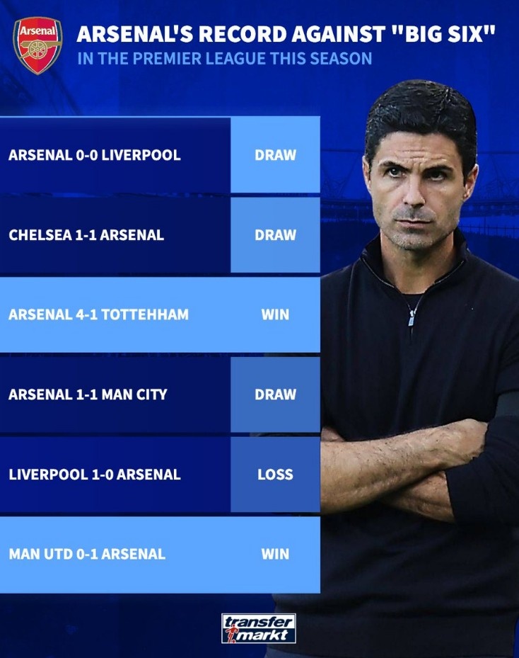 赛后相关数据统计,阿森纳本赛季面对Big6战绩颇为平庸,仅击败了热刺、曼联,与利物浦(主)、切尔西、曼城战平,唯一失利是客场不敌利物浦。