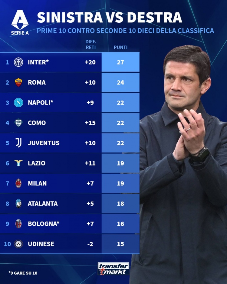 北京时间1月9日,德国转会市场统计出来了意甲联赛积分榜前十球队在面对下半区球队获得的积分排名,其中国米以27分排名第一,其次是罗马、那不勒斯、科莫。
