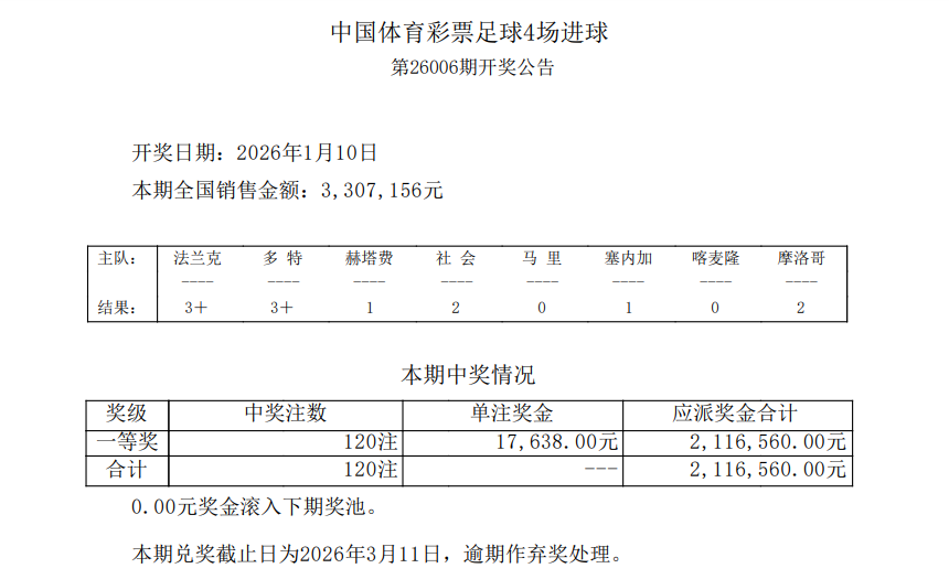 4场进球26006期开奖:多特3-3法兰克福!头奖120注
