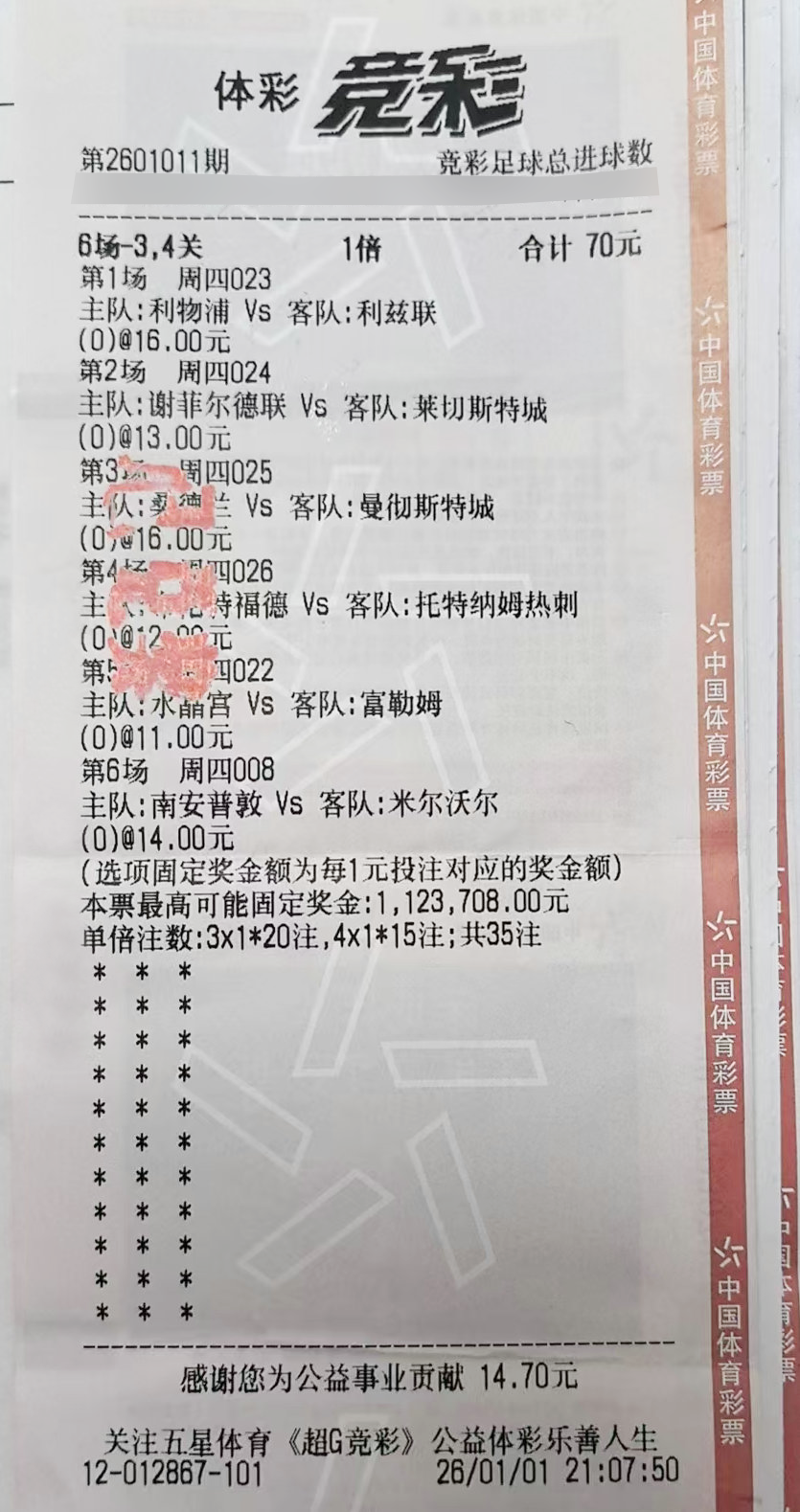 本月初,来自上海浦东彩民购买了竞彩总进球数,6场过3、4关合计70元,最终6中4得到税前11万多元的奖金。
