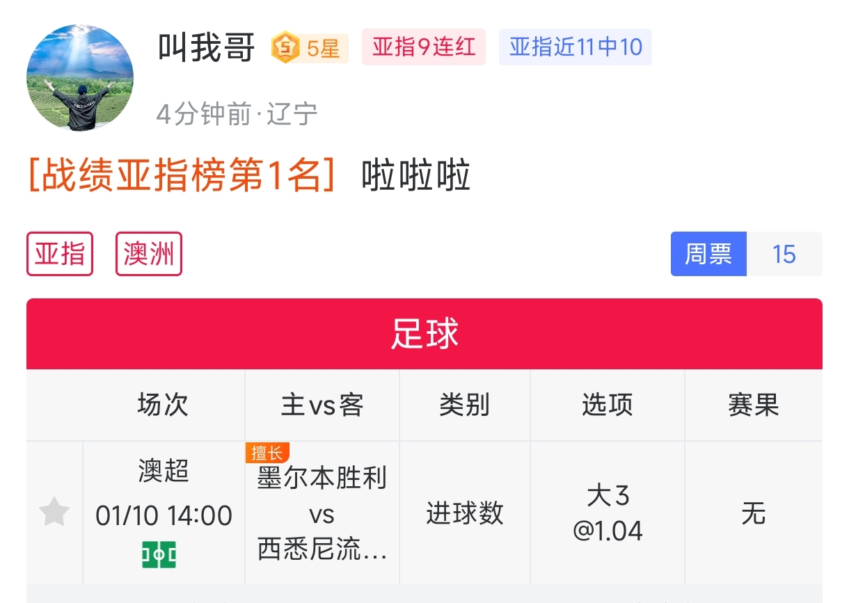 今天他继续公推一场澳超进球数,墨尔本胜利vs西悉尼流浪者,感兴趣可以作为参。