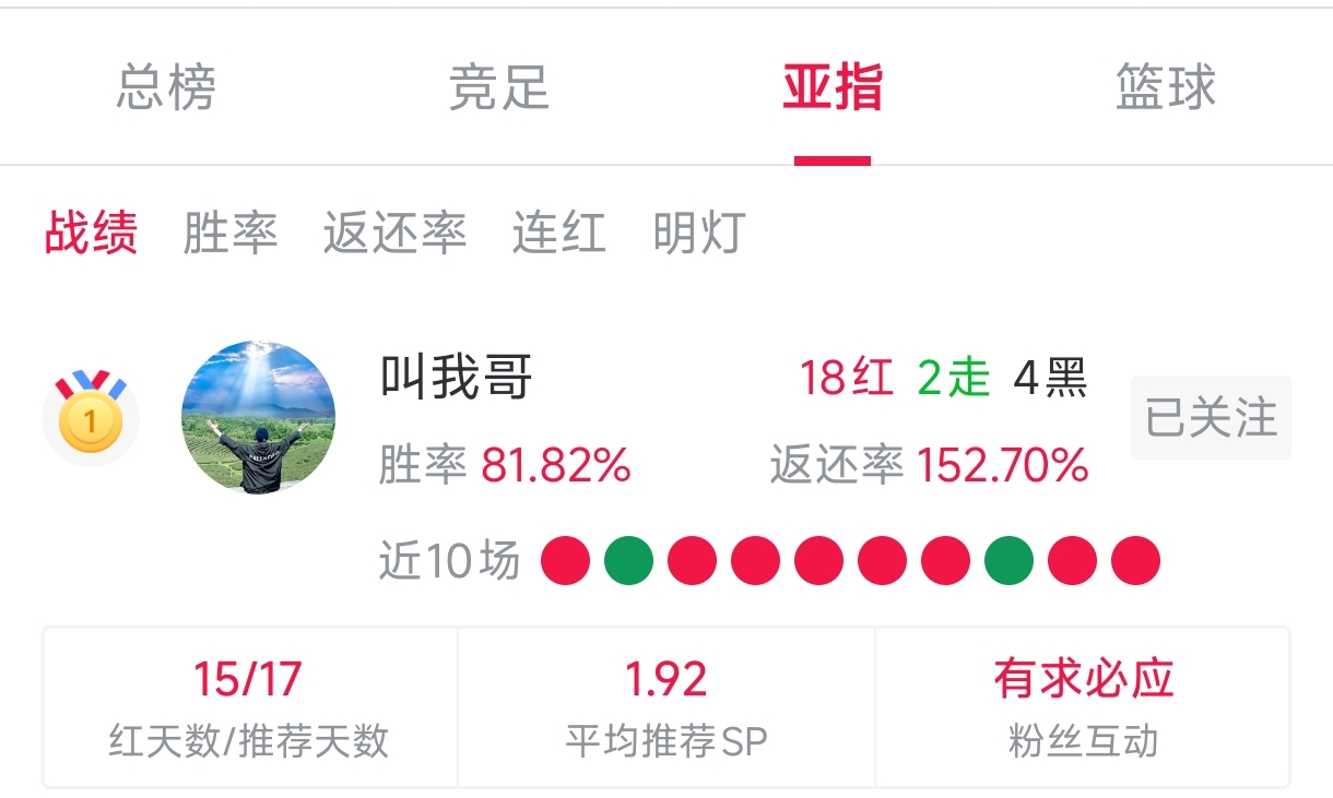 恭喜用户“叫我哥 ”亚指9连红,近11中10,亚指战绩榜依然排名第一,近30天亚指胜率和返还率都排名第一,粉丝数暴涨!