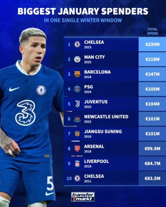 2026年冬季转会窗口已经开启,各支球队都在寻找补强机会。德国转会市场盘点了单个冬窗足坛俱乐部引援花费情况,其中2023年切尔西排名第一,2016年中超球队江苏苏宁同样上榜。