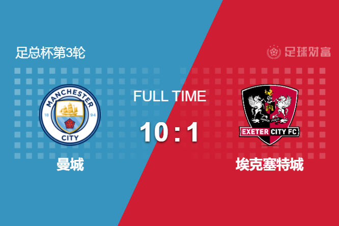 最终全场比赛结束,曼城10-1狂胜埃克塞特城晋级。