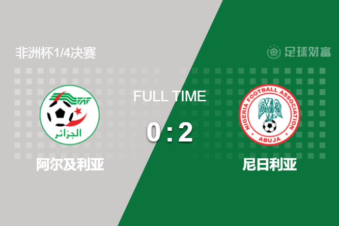 最终全场比赛结束,尼日利亚2-0淘汰阿尔及利亚晋级四强。