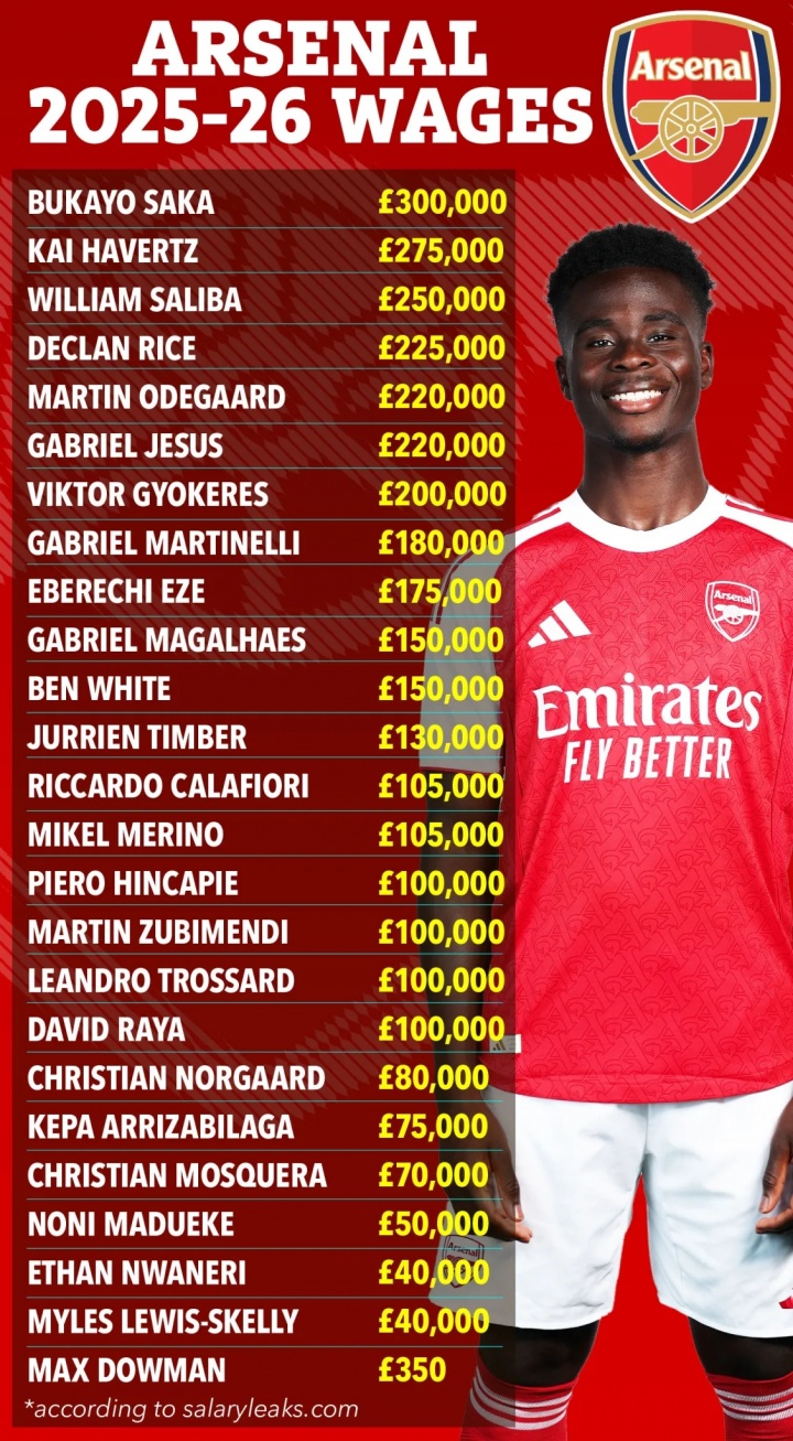 💰️阿森纳队内周薪排名:萨卡30万镑居首,赖斯仅第四