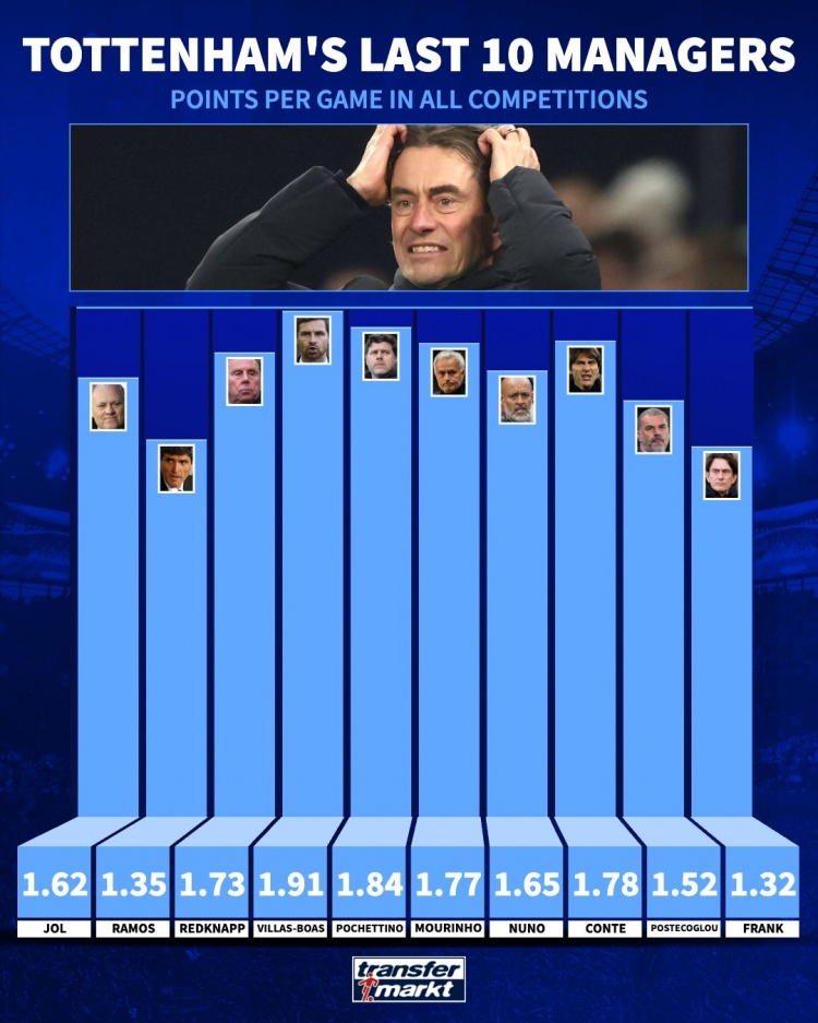 战绩糟糕!弗兰克执教热刺场均1.32分,近10位主帅最差