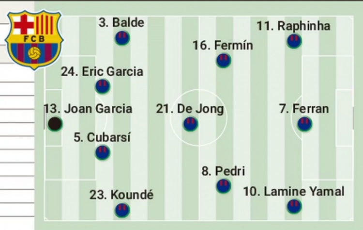 门将位置将由霍安·加西亚担任,库巴西领衔后防线,中场位置德容领衔,锋线则有拉菲尼亚、费兰、亚马尔组成三叉戟,莱万则是替补待命。