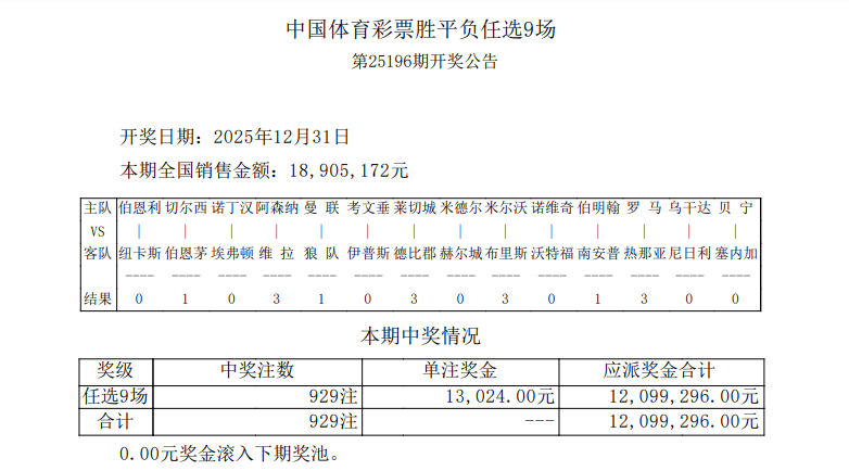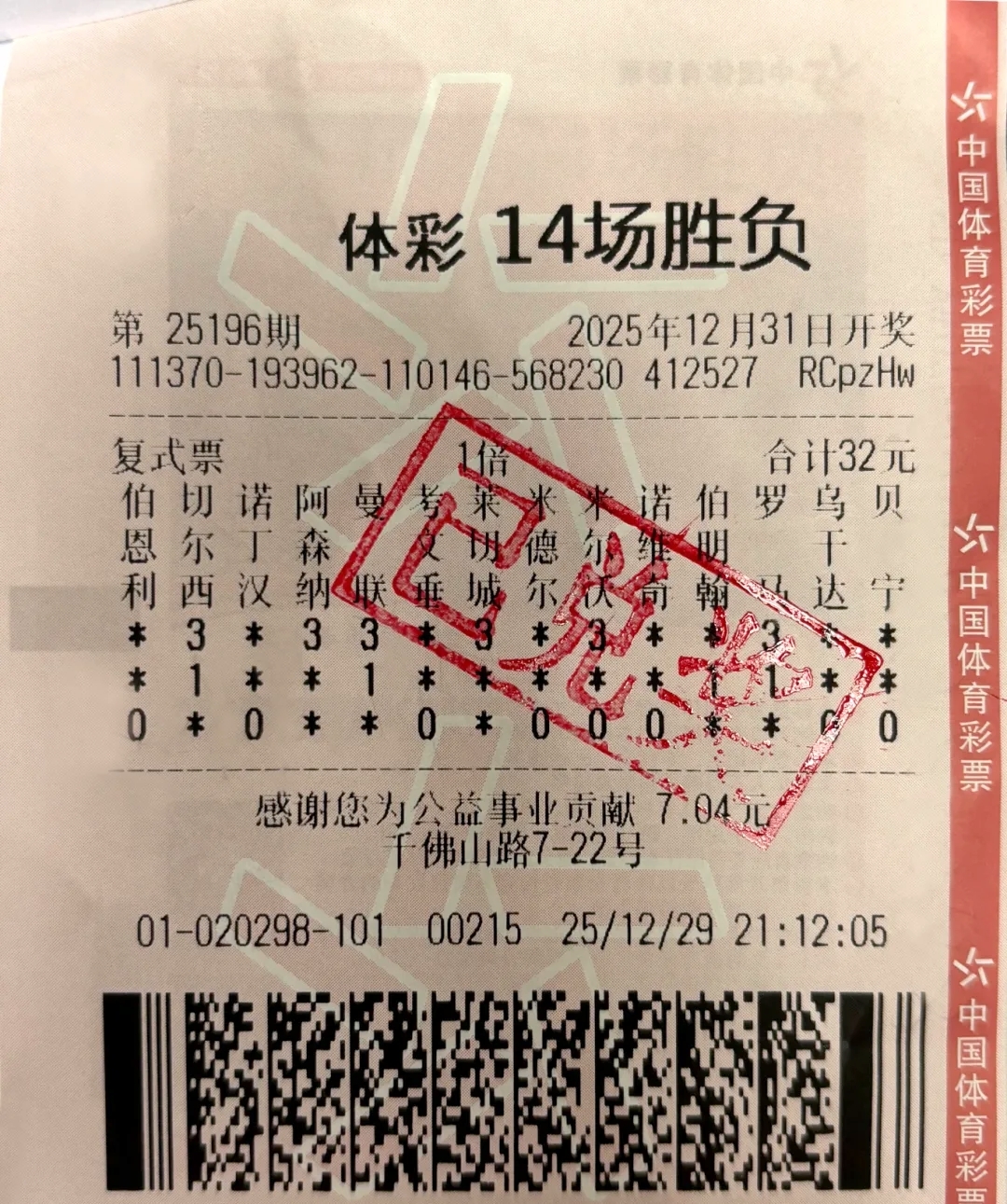在2025年最后一期(25196期)胜负彩开奖中,来自山东的刘大爷凭借一张32元复试票,收获1住一等奖(3351320元)和4注二等奖(单注36515元),最终奖金是税前3497380元,下面咱们看看刘大爷是怎么选的。