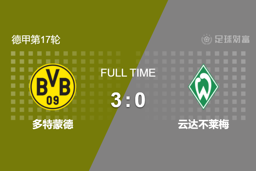 最终全场比赛结束,多特蒙德主场3-0击败云达不莱梅取得一场大胜。