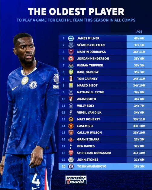 德国转会市场盘点了英超各支球队最年长出场纪录,其中布莱顿老将米尔纳以40岁年龄领衔,切尔西这几个赛季则是大幅度年轻化,本赛季最年长出场球员为28岁的阿达拉比奥尤。