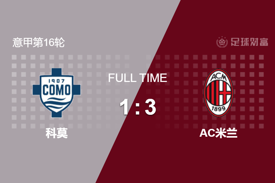 最终全场比赛结束,科莫1-3不敌米兰。