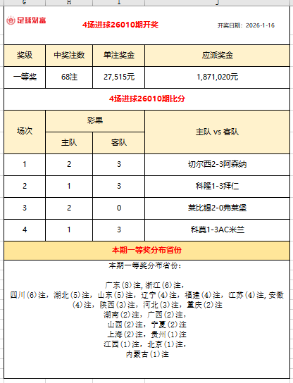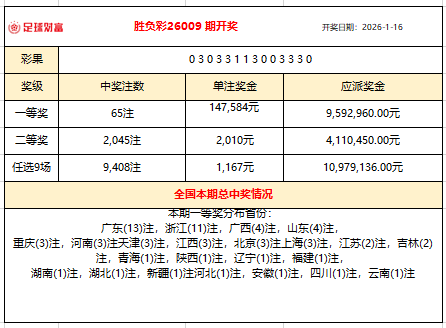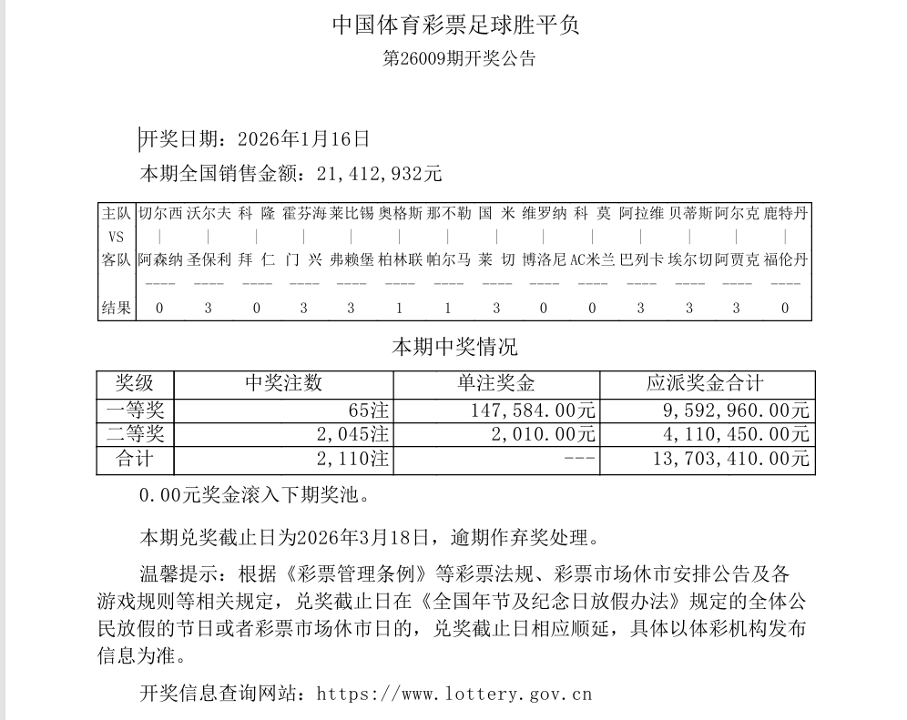 胜负彩26009期开奖:切尔西2-3阿森纳,头奖达65注