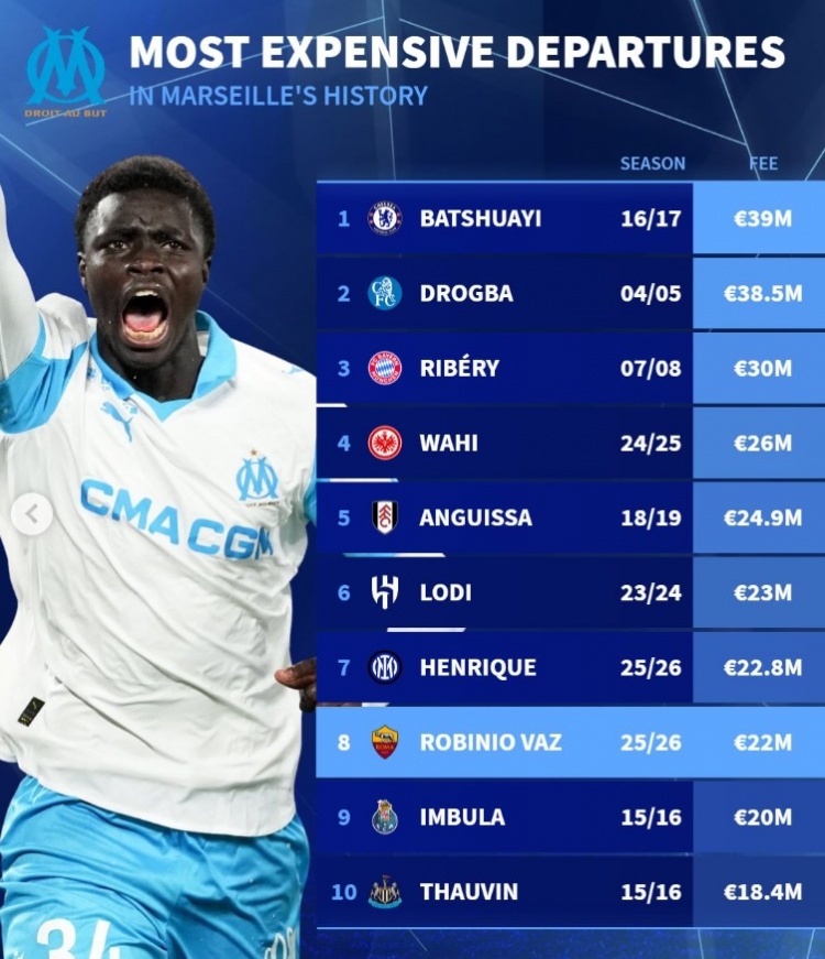 德国转会市场网站盘点了马赛队史最贵售出球员,其中2016年巴舒亚伊以3900万欧元加盟切尔西排名第一。