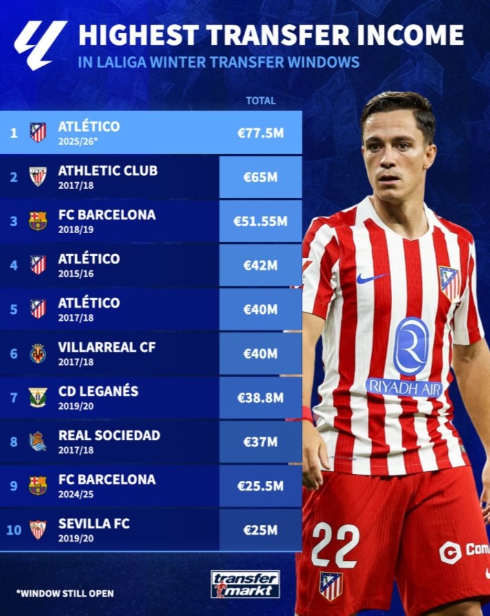 北京时间1月16日,德国转会市场更新了西甲联赛冬季转会窗口收入排名,马竞在冬窗凭借出售加拉格尔、拉斯帕多里等人入账7750万欧元,成为西甲历史冬窗收入最高的俱乐部。