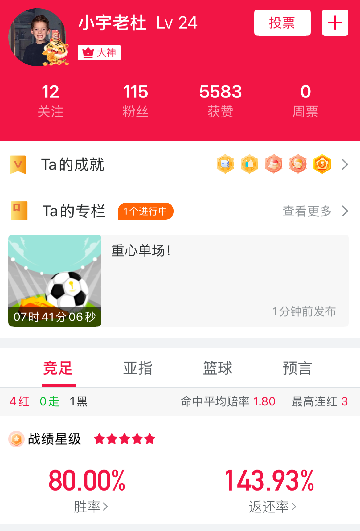 用户小宇老杜 亚指近11中10,竞足近6中5胜率不俗,今日公推意甲比萨vs亚特兰大,可供参考。