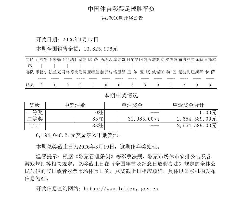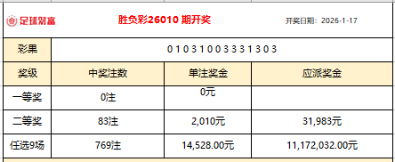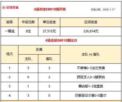 胜负彩26010开奖:不莱梅3-3法兰克福,头奖滚存619万