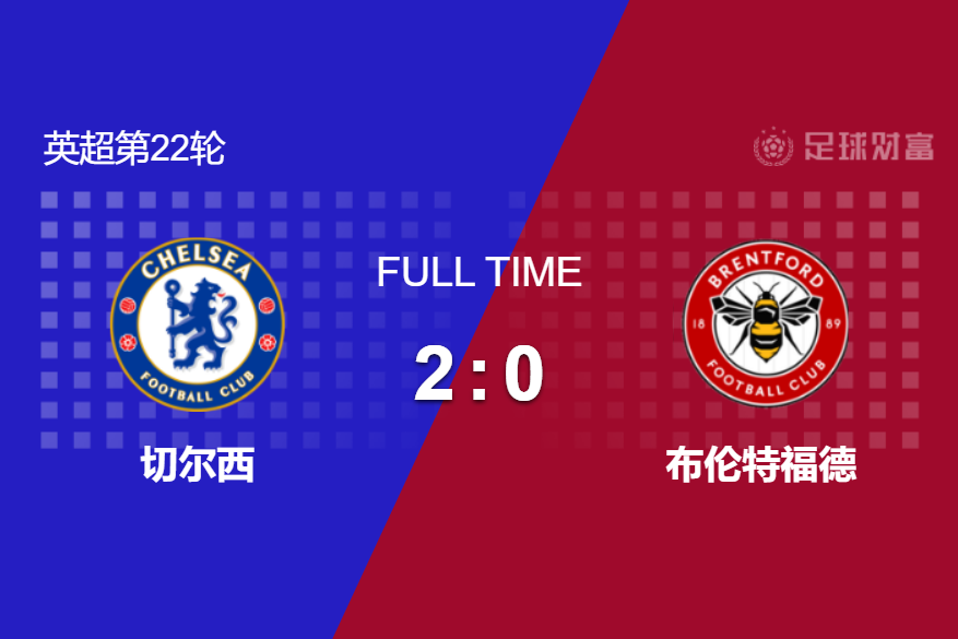 最终全场比赛结束,切尔西主场2-0击败布伦特福德。