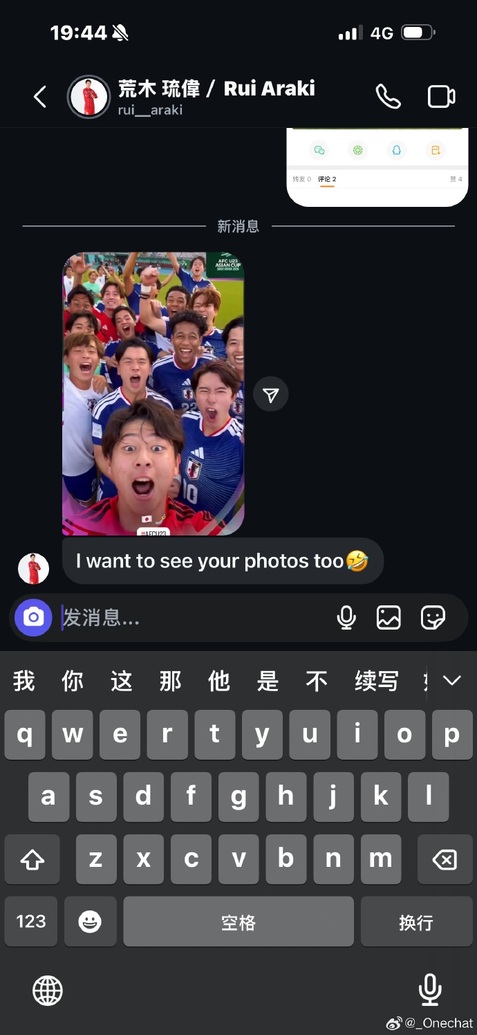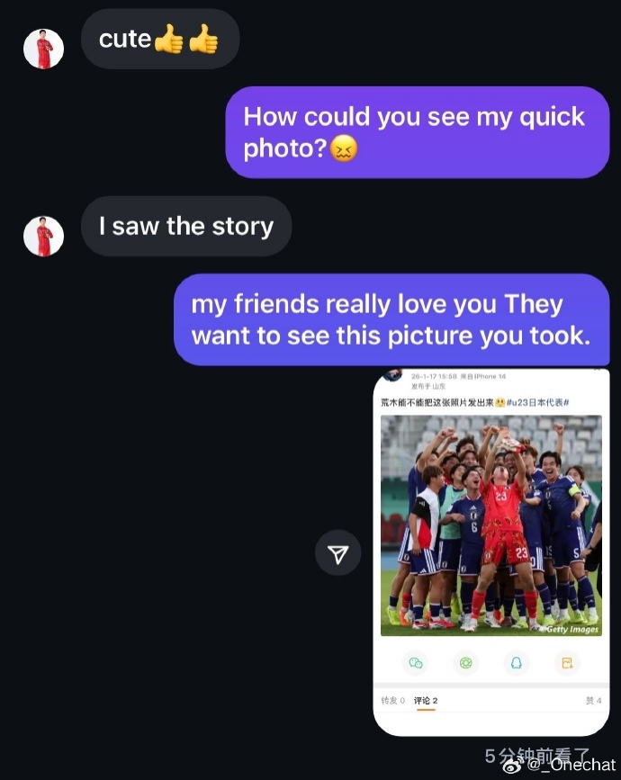 据微博博主“_Onechat”透露,自己在INS社交平台遭到日本U23门将荒木琉伟骚扰,对方向其索要性感照片,并希望两人可以发生性关系。
