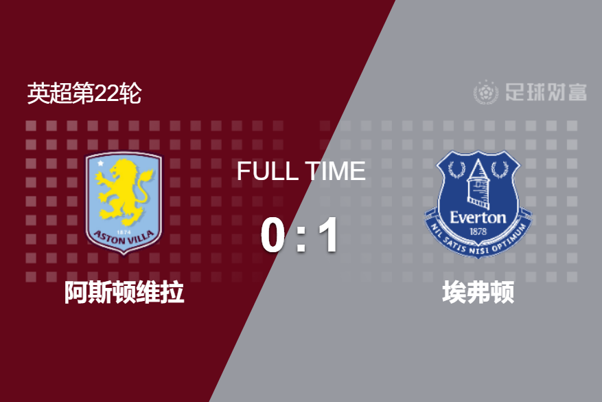 最终全场比赛结束,维拉主场0-1不敌埃弗顿。