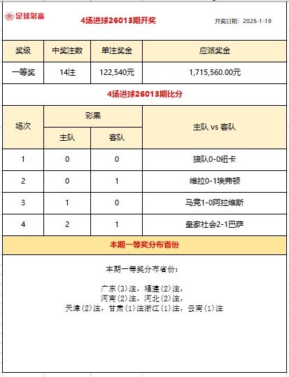 胜负彩26012期开奖:皇家社会2-1巴萨,一等奖13注370万